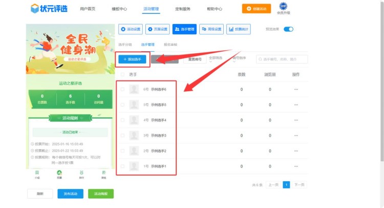 然后,在【选手管理】中点击【添加选手】或者【示例选手】,上传所有选手的个人资料,包括选手的名称、简介、照片或者视频等。
