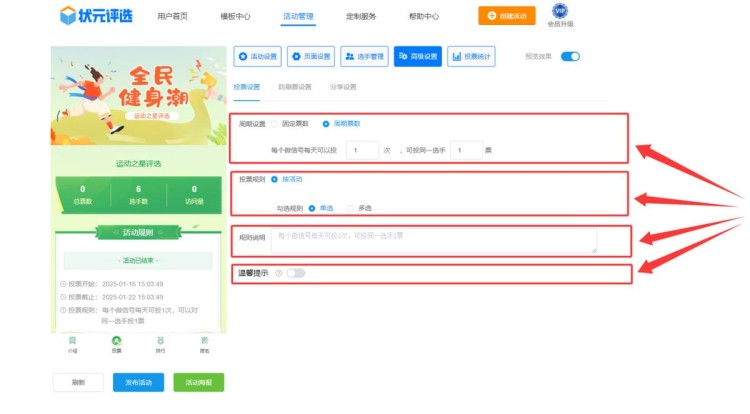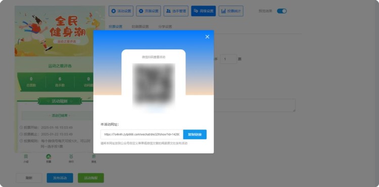 最后,点击【发布活动】,系统会自动生成投票链接和二维码。将其保存下来并分享至微信群、朋友圈等社交媒体,即可开启线上投票活动,选出最终的获胜者。