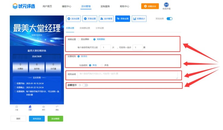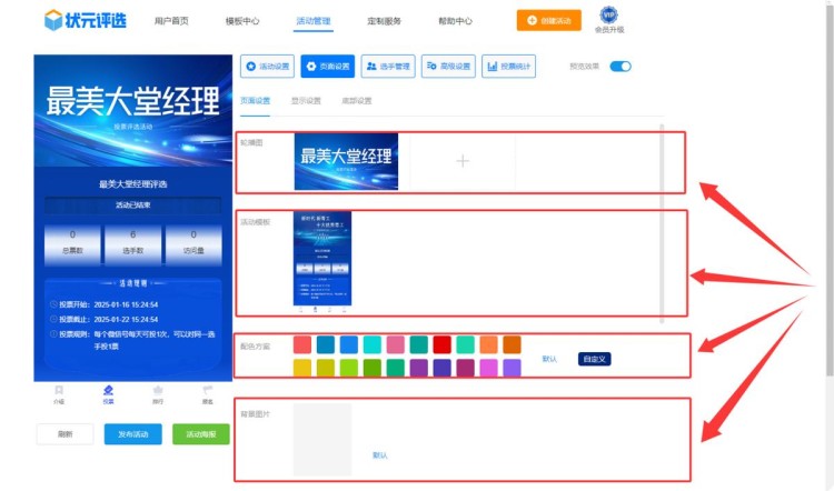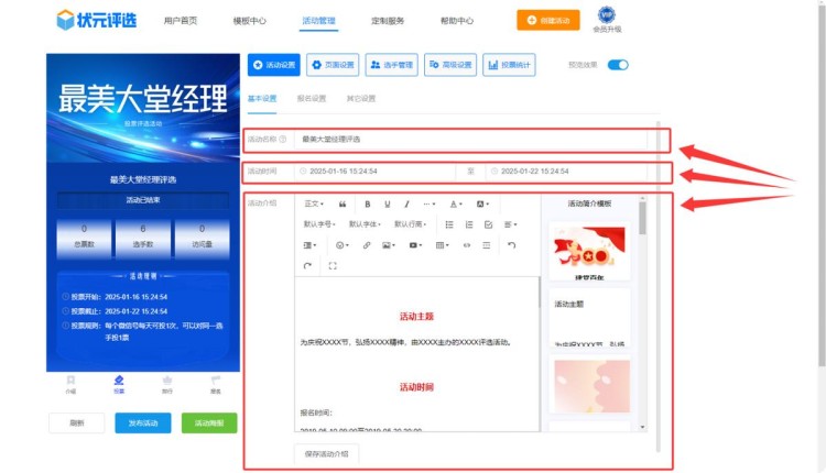 在【活动设置】中,将活动名称改为最美大堂经理评选,并设置活动起止时间、编辑活动介绍。