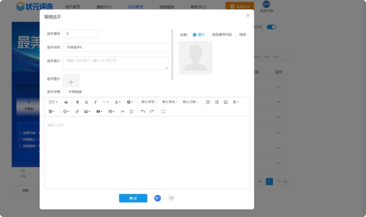 在【选手管理】中,上传所有选手的个人资料,包括选手名称、简介、照片或者视频等。