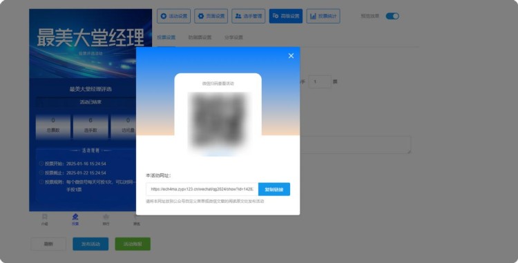 点击【发布活动】,系统会自动生成投票链接和二维码。这样最美大堂经理网络评选活动就制作完成了,是不是很简单?