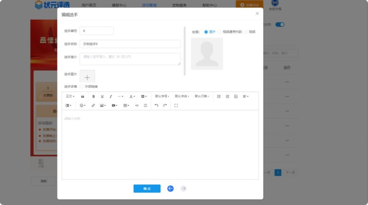 第五步,在【选手管理】中,上传所有选手的个人资料,包括选手的名称、简介、照片或者视频等。