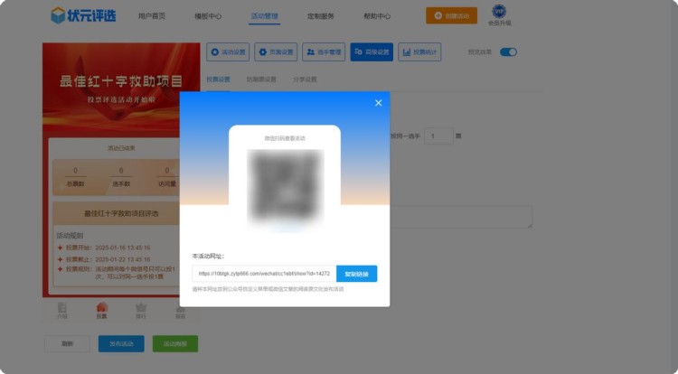第七步,上面这些步骤完成,且仔细检查确定没有问题后,点击【发布活动】,系统会自动生成投票链接和二维码。这样一场与世界红十字日相关的网络投票评选活动就创建完成了,是不是很简单?