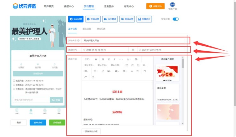 在【活动设置】中,修改活动名称、设置活动时间、编辑活动介绍。