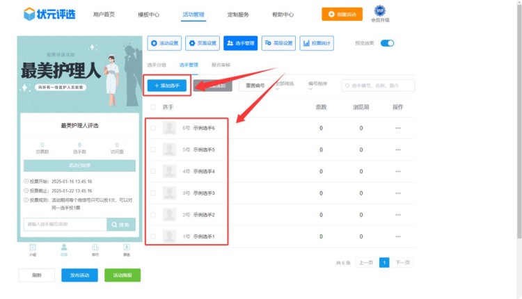 在【选手管理】中,上传所有选手的个人资料,包括选手的,参、简介、照片或者视频等。