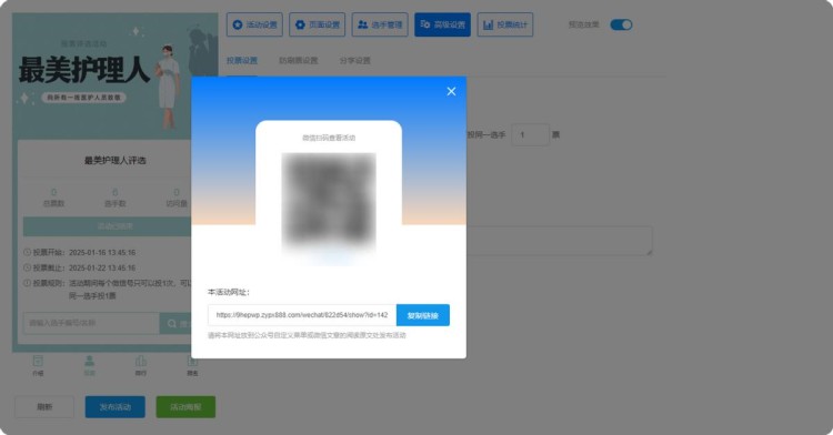 上述步骤完成后,点击【发布活动】,系统会自动生成投票了和二维码。这样一场与国际护士节相关的网络投票评选活动就制作完成了,是不是很简单?