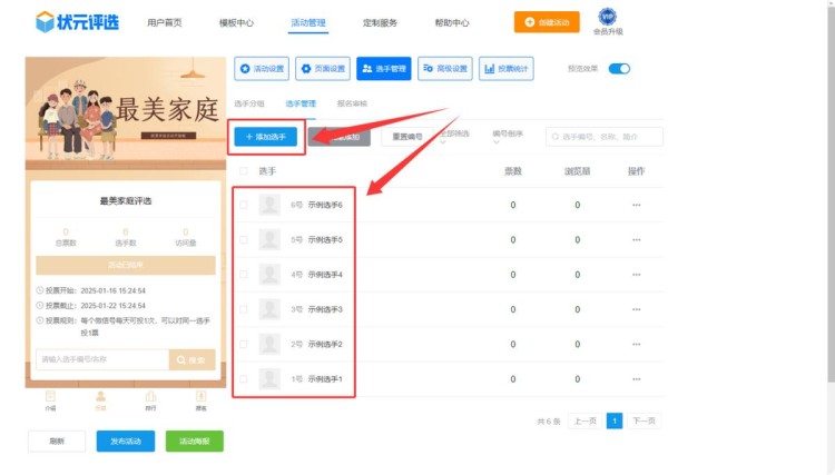 在【选手管理】中,上传所有选手的个人资料,包括选手的名称、简介、照片或者视频等。
