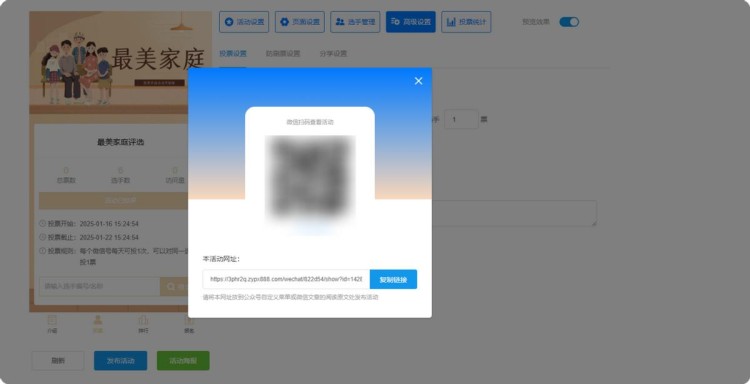 点击【发布活动】,系统会自动生成投票链接和二维码。将其保存下来并分享至朋友圈、微信群等社交媒体上,即可开启网络评选活动,选出最终的获胜者。