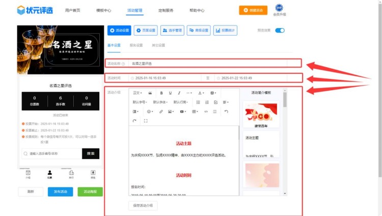 第三步,在【活动设置】中,修改活动名称、设置活动时间、编辑活动介绍。