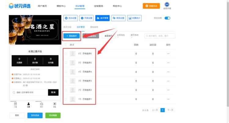第五步,在【选手管理】中,上传所有选手的个人资料,包括选手的名称、简介、照片或者视频等。