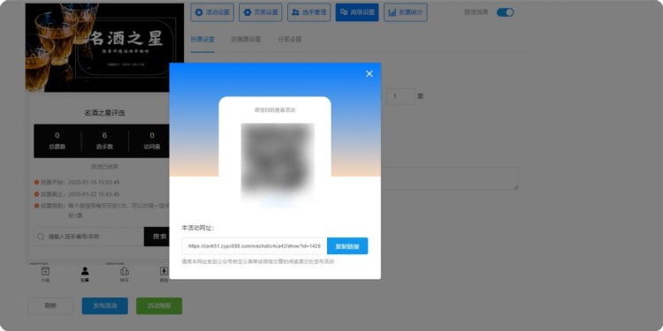 第七步,上述步骤完成后,点击【发布活动】,系统会自动生成投票链接和二维码。将其保存下来并分享出去,即可开启线上投票评选活动,选出最终的获胜者。