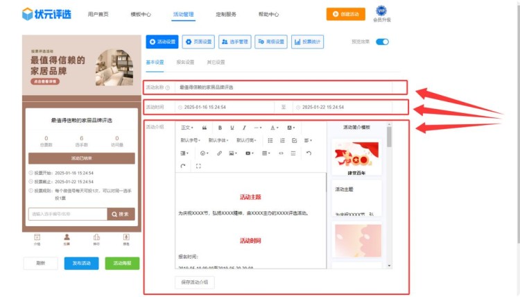 第三步,在【活动设置】中,将活动名称改为最值得信赖的家居品牌评选,并设置活动开始和结束的时间,编辑活动介绍。
