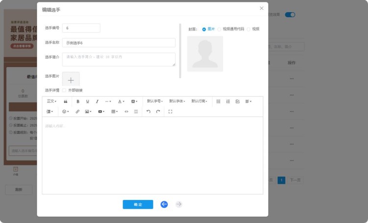 第五步,在【选手管理】中,上传所有选手的个人资料,包括选手的名称、简介、照片或者视频等。