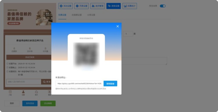 第七步,上述步骤完成后,点击【发布活动】,系统会自动生成投票链接和二维码。这样影响最值得信赖的家居品牌微信评选活动就制作完成了,是不是很简单?