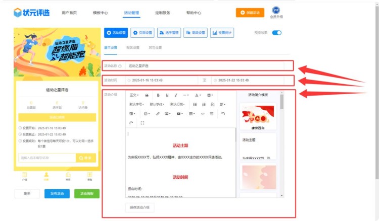 第三步,在【活动设置】中,修改活动名称、设置活动起止时间、编辑活动介绍。
