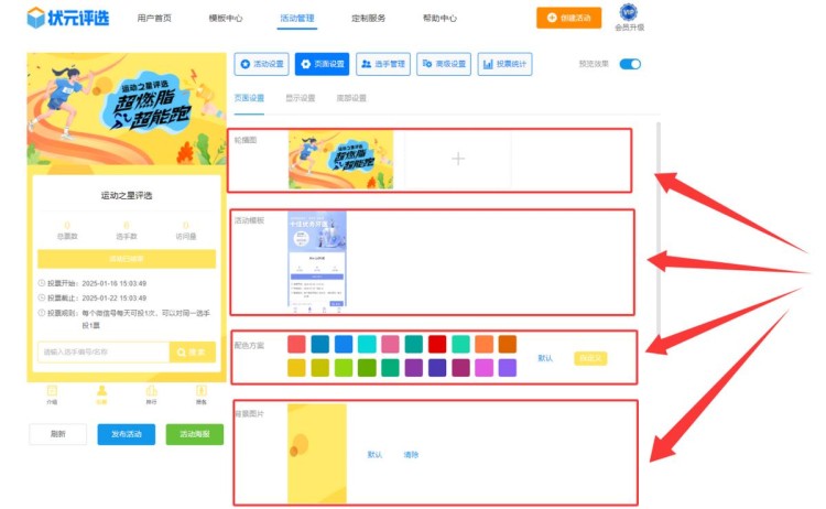 第四步,在【页面设置】中,上传主题轮播图,并根据轮播图的颜色,来调整配色方案、更换背景图片等。