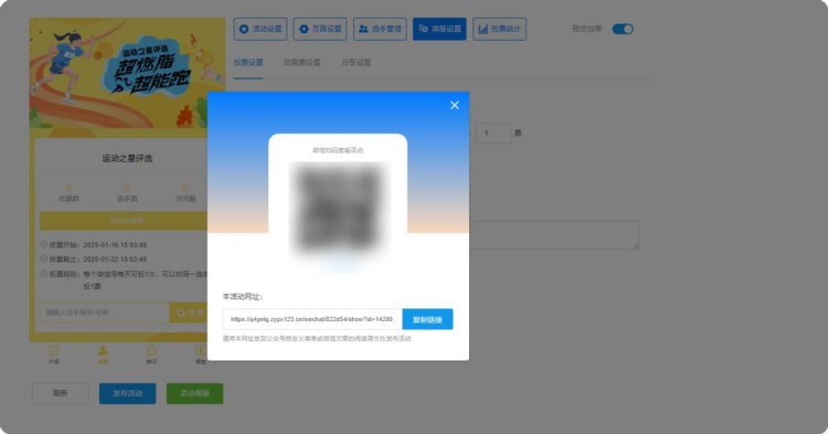 第七步,上述步骤完成后,点击【发布活动】,系统会自动生成投票链接和二维码。将其保存下来并分享出去,即可开启微信评选活动,选出最终的获胜者。
