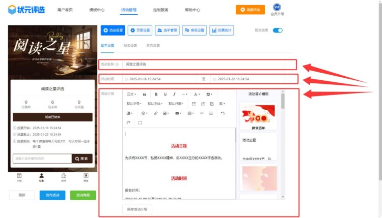 第三步,在【活动设置】板块,修改活动名称、合理设置活动的起止时间(确保参与者有足够的时间参与投票)、编辑活动介绍。