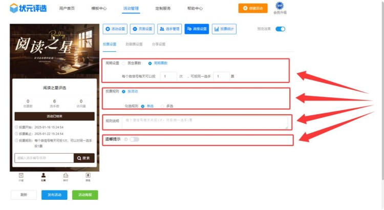 第六步,在【高级设置】中,仔细设置投票规则。例如,是否允许为同一选手重复投票、投票的限制条件等,以确保投票过程的公平公正。
