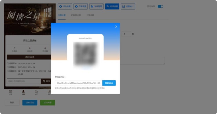 第七步,当上述所有步骤都顺利完成后,点击【发布活动】按钮,系统会自动生成投票链接和二维码。将它们保存下来,并通过各种渠道分享出去,如微信群、朋友圈等。这样即可开启H5投票评选,选出最终的获胜者。