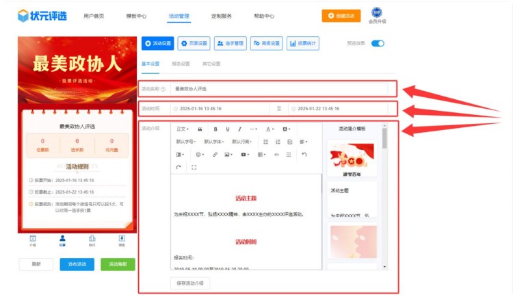 第三步,在【活动设置】中,将活动名称改为最美政协人评选,并设置活动的起止时间、编辑活动介绍。
