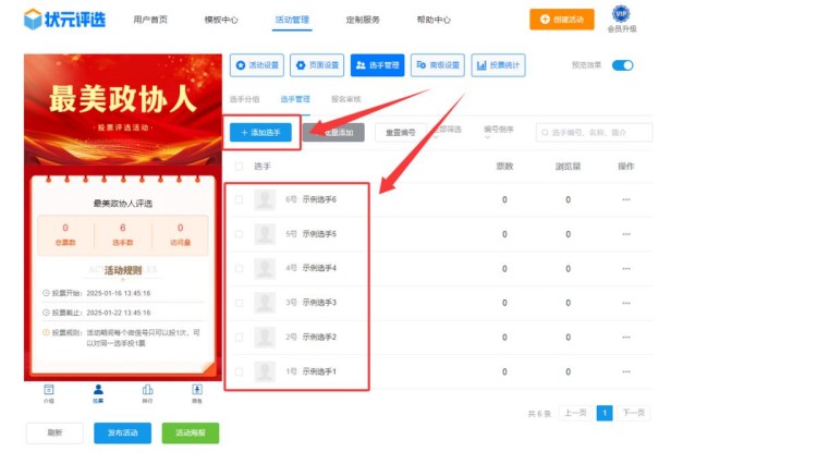 第五步,在【选手管理】中,上传所有选手的个人资料,包括选手的名称、简介、照片或者视频等。