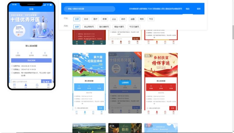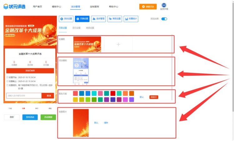 第二步,登录后,系统会自动跳转至活动后台。在【模板中心】,选择合适的模板样式,如知识产权十大事件、创业之星等。