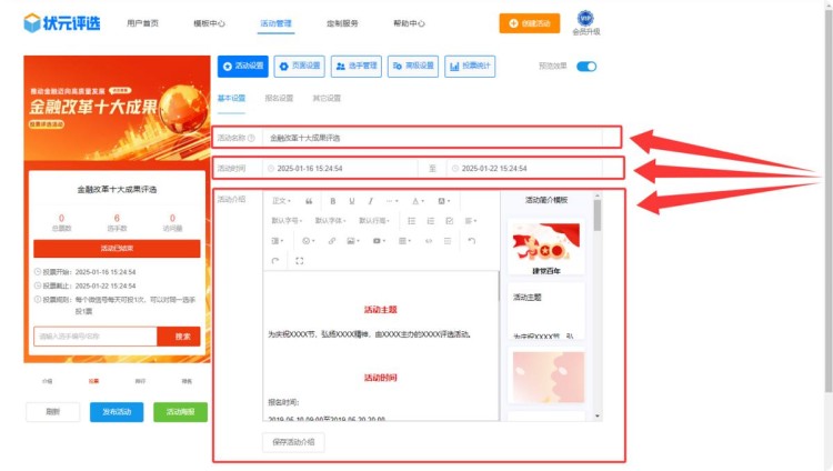 第三步,在【活动设置】中,修改活动名称、设置活动时间、编辑活动介绍。