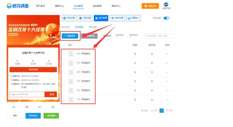 第五步,在【选手管理】中,上传所有选手的个人资料,包括选手的名称、简介、照片或视频等。