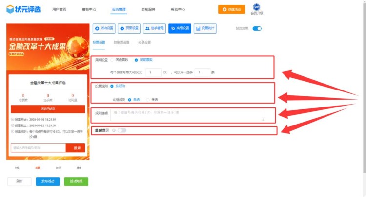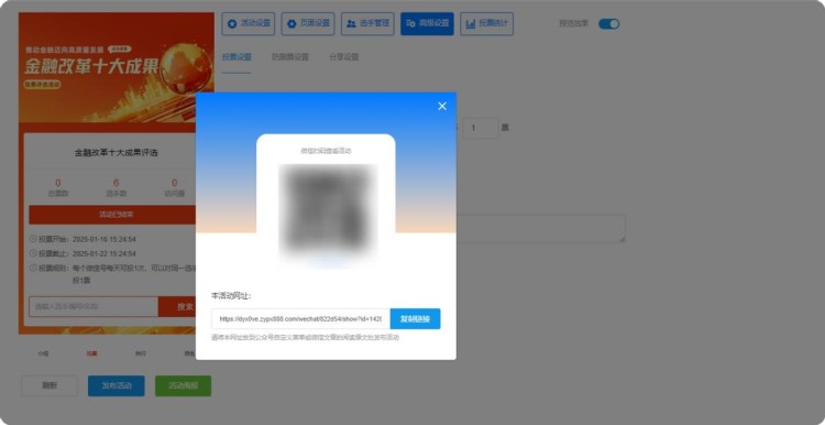 第七步,上述步骤完成,且仔细检查确定没有问题后,点击【发布活动】,系统会自动生成投票链接和二维码。将其保存下来并分享出去,即可开启视频评选活动,选出最终的获胜者。