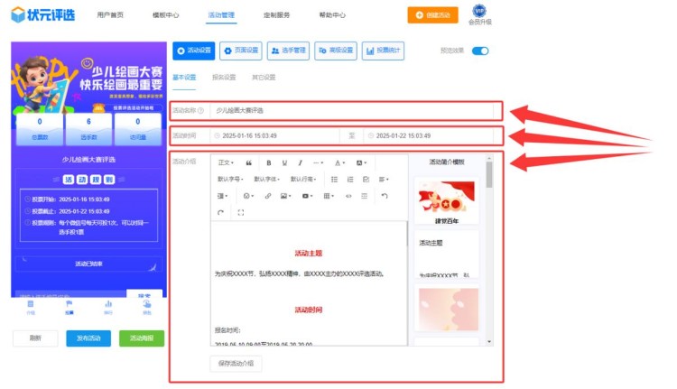 再者,在【活动设置】中,修改活动名称、设置活动起止时间、编辑活动介绍。