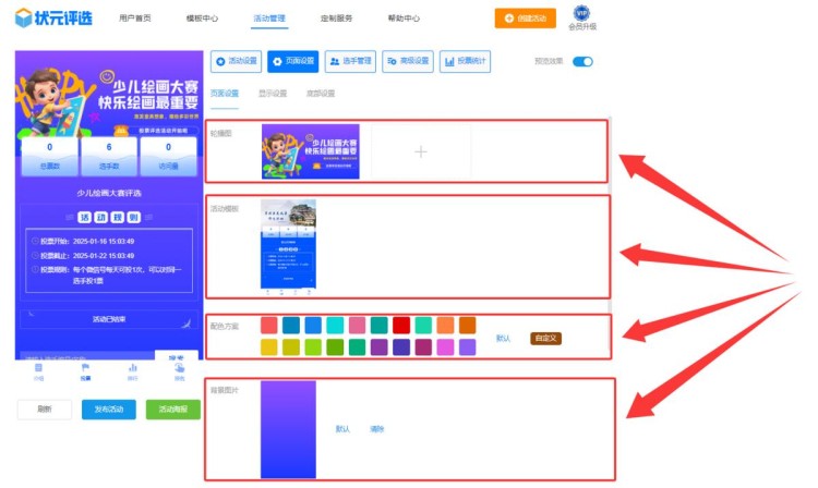 接下来,在【页面设置】中,上传主题轮播图,并根据活动需要,完成其他页面设置上的操作,如添加背景音乐、漂浮物等。