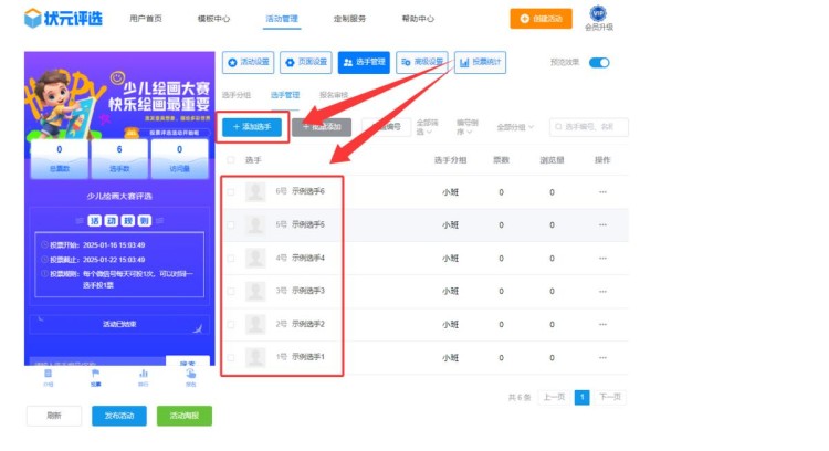 然后,在【选手管理】中,上传所有选手的个人资料,包括选手的名称、简介、照片或者视频等。