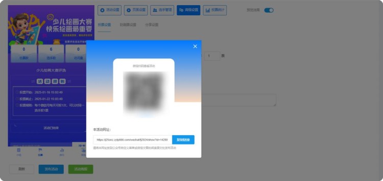 最后,点击【发布活动】,系统会自动生成投票链接和二维码。这样一场微信投票活动就制作完成了,是不是很简单?