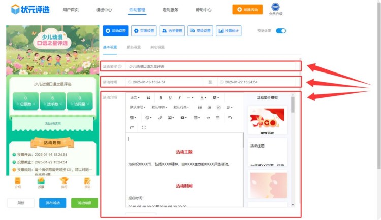 第三步,在【活动设置】中,修改活动名称、设置活动起止时间、编辑活动介绍。