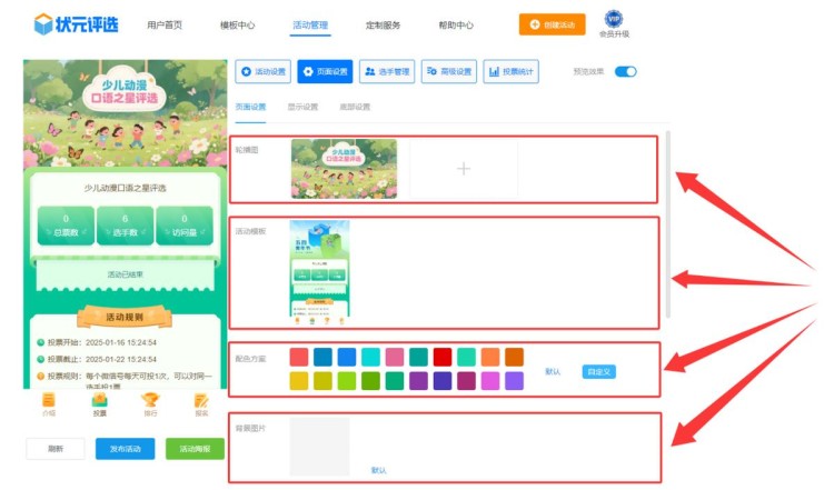 第四步,在【页面设置】中,上传主题轮播图的颜色,来调整配色方案、更换背景图片等。