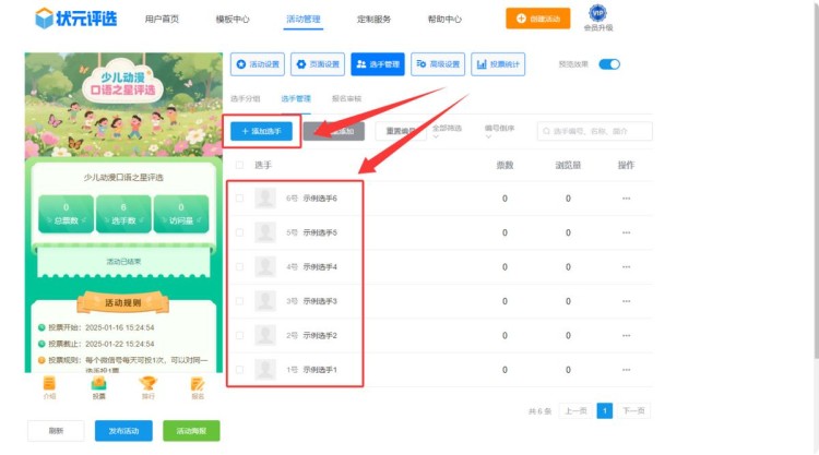 第五步,在【选手管理】中,上传选手的信息,包括名称、简介、照片或者视频等。