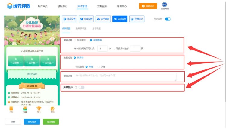 第六步,在【高级设置】中,设置投票规则。