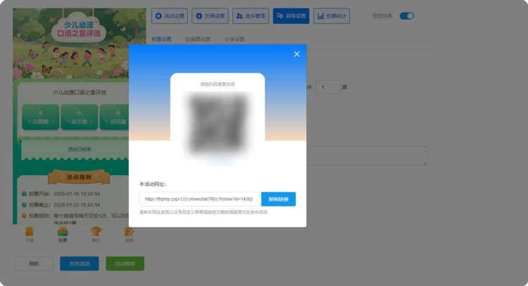 第七步,上述步骤完成后,点击【发布活动】,系统会自动生成投票链接和二维码。这样一场微信投票活动就制作完成了,是不是很简单?