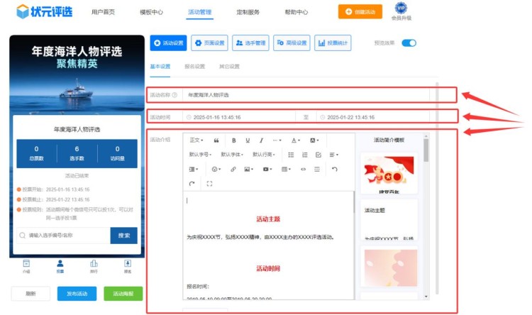 第三步,在【活动设置】中,将活动名称改为年度海洋人物,并设置活动起止时间、编辑活动介绍。