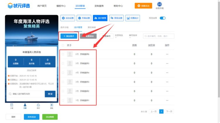 第五步,在【选手管理】中,上传所有选手的个人资料,包括选手的名称、简介、照片或者视频等。
