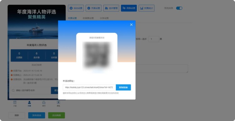 第七步,点击【发布活动】,系统会自动生成投票链接和二维码。这样年度海洋人物微信投票评选活动就制作完成了,您学会了吗?
