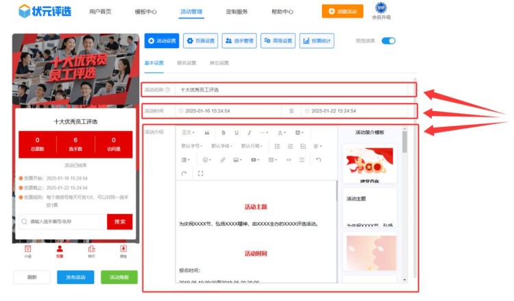 第三步,在【活动设置】中,修改活动名称、设置活动时间、编辑活动介绍。