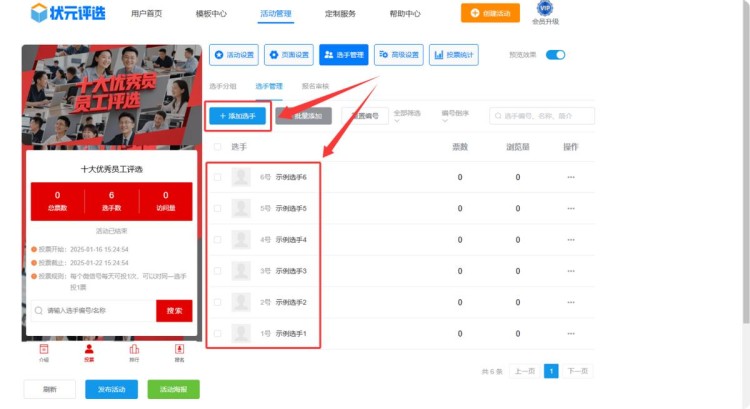 第五步,在【选手管理】中,上传所有选手的个人资料,包括选手的名称、简介、照片或者视频等。