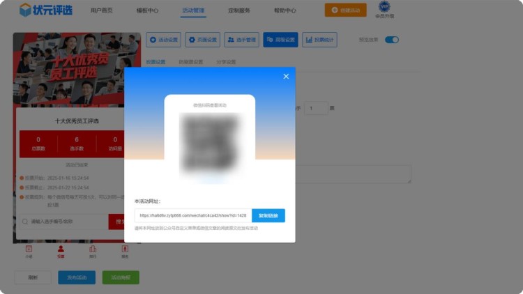 第七步,上述步骤完成后,点击【发布活动】,系统会自动生成投票链接和二维码。这样一场微信投票评选活动就制作完成了,是不是很简单?
