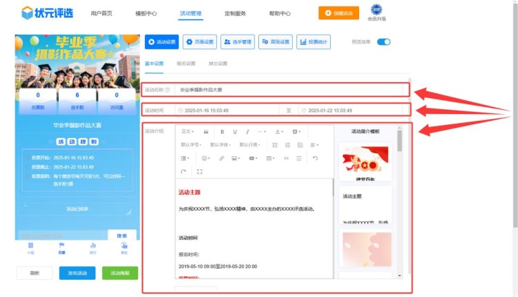 第三步,在【活动设置】中,修改活动名称、设置活动时间、编辑活动介绍。
