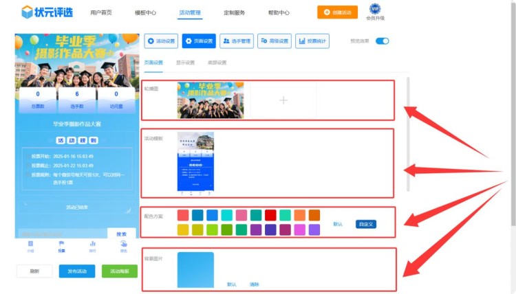 第四步,在【页面设置】中,上传主题轮播图,并根据轮播图的颜色,来调整配色方案、更换背景图片等。