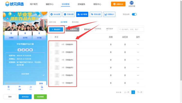第五步,在【选手管理】中,上传所有作品资料,包括名称、简介、照片或者视频等。