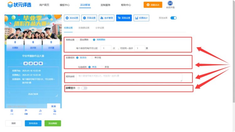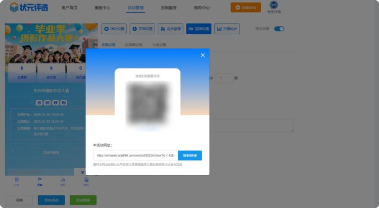 第七步,上述步骤完成后,点击【发布活动】,系统会自动生成投票链接和二维码。将其保存下来并分享出去,即可开启微信评选活动,选出最终的获胜者。
