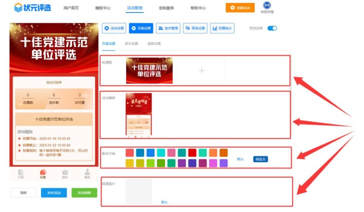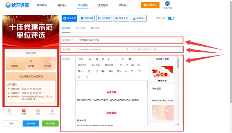 在【活动设置】中,将活动名称改为十佳党建示范单位评选,并设置活动起止时间、编辑活动介绍。